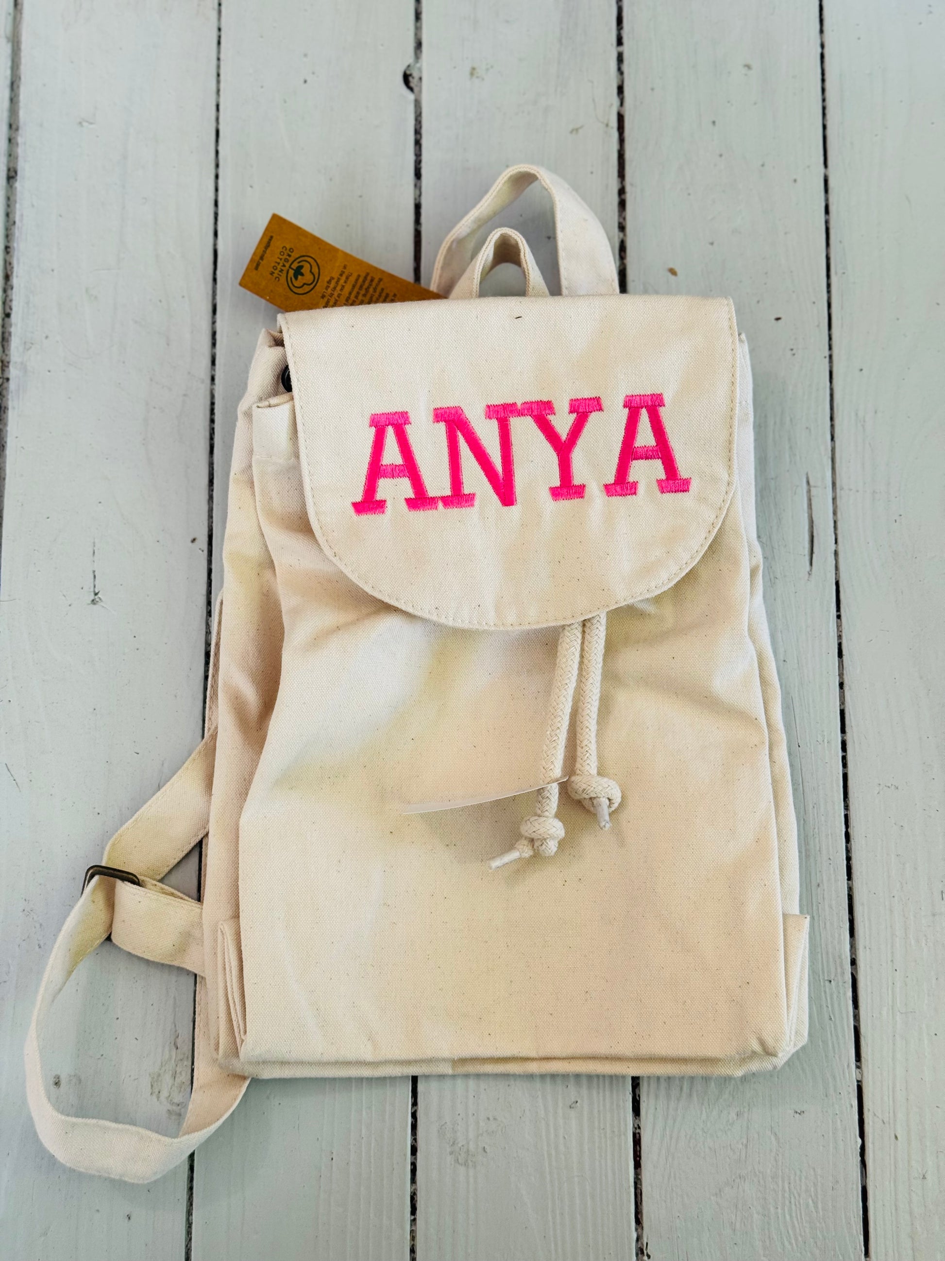 Organikus pamut anyagú rózsaszín hímzett feliratos hátizsák.